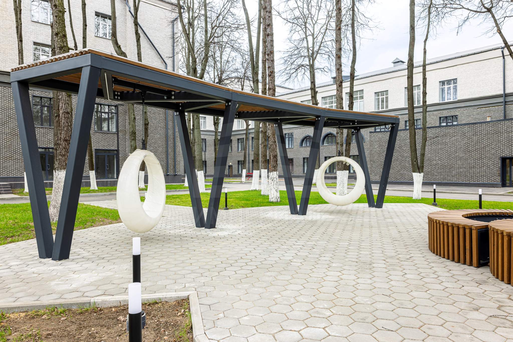 Красивый двор парк с вековыми вечнозелеными деревьями создает особую загородную атмосферу старинной усадьбы. На огороженной безопасной зеленой территории расположены спортивная площадка и места отдыха, оборудован паркинг.
