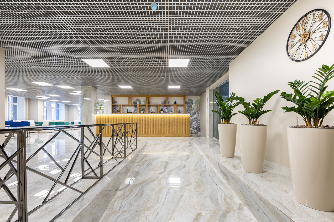 - В холле расположено лобби со стойкой ресепшн и лаунж зоны. При входе предусмотрено место хранения детского транспорта и колясок