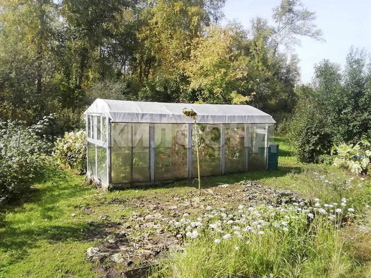 Есть плодовые деревья и кустарники. Теплица.