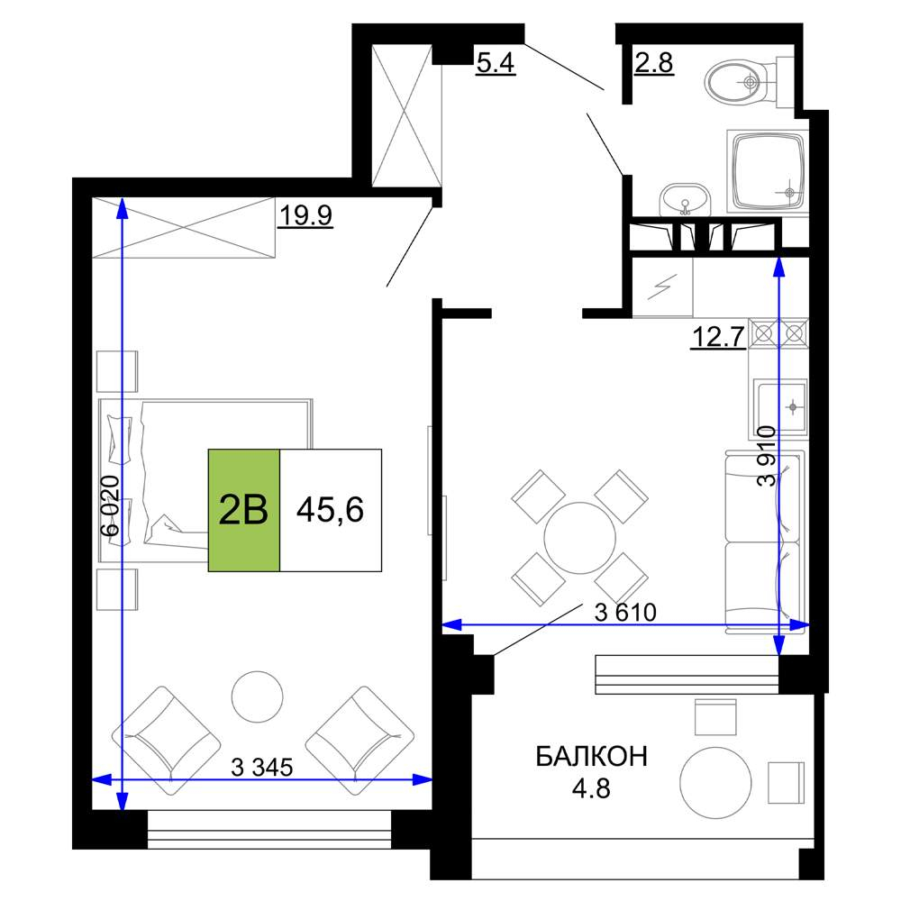 Общая площадь: 48.2