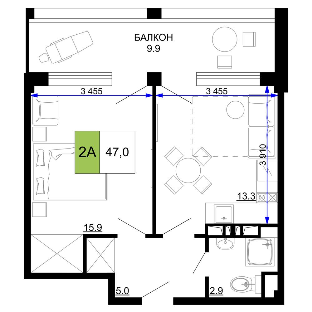 Жилая площадь 15.4 м2, кухня 13.3 м2, чистовая отделка с мебелью.
