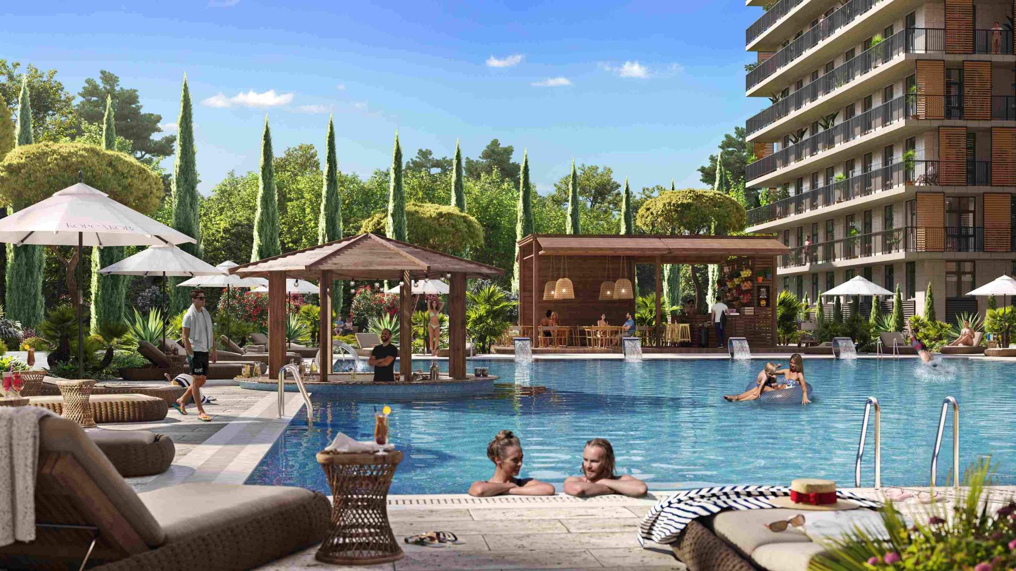 Отдельная многоуровневая парковка, парковка охраняется. Обеспечение безопасности: видеонаблюдение, круглосуточная охрана. Инфраструктура: детские площадки, спортивные площадки, места для отдыха, супермаркет, рестораны, фитнес-центр, пункты бытового обслуживания, коммерческие объекты.