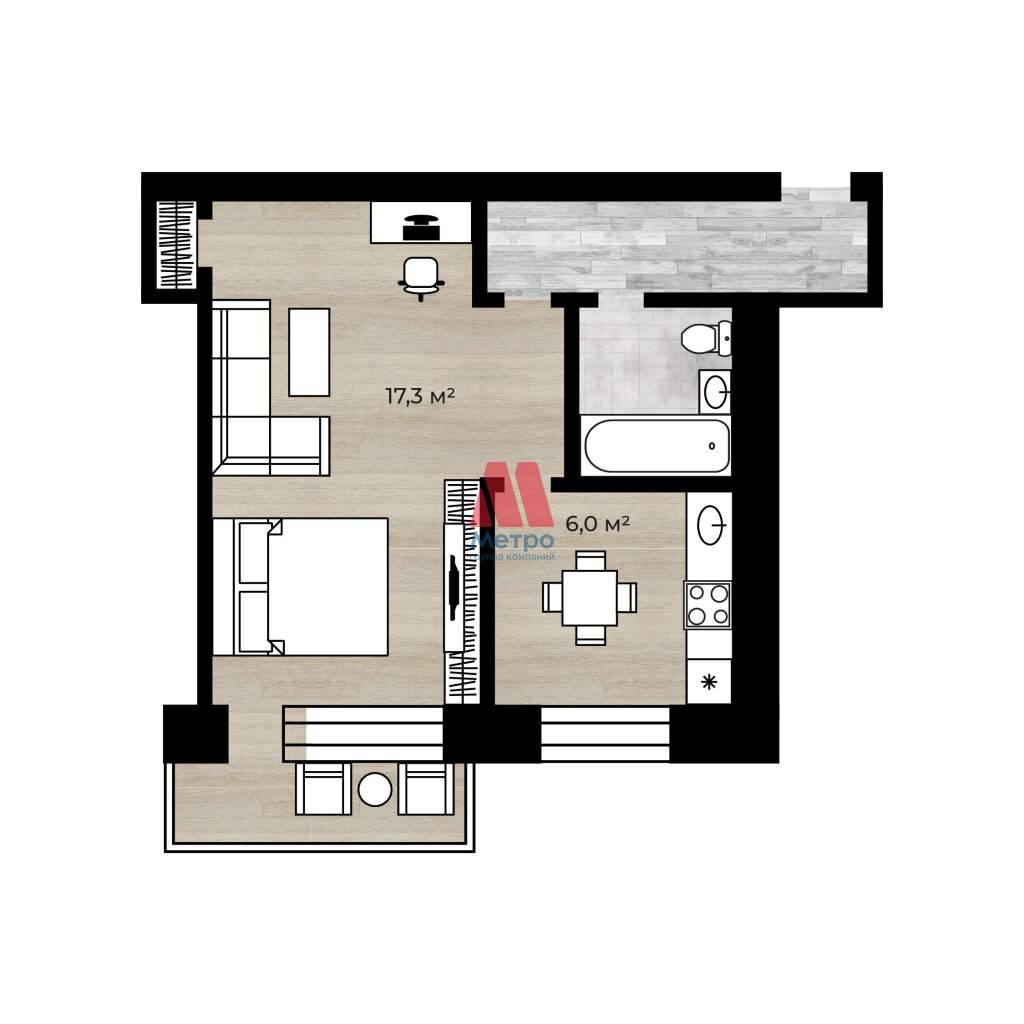 Общая площадь: 30.9 м2, удобная для жизни.