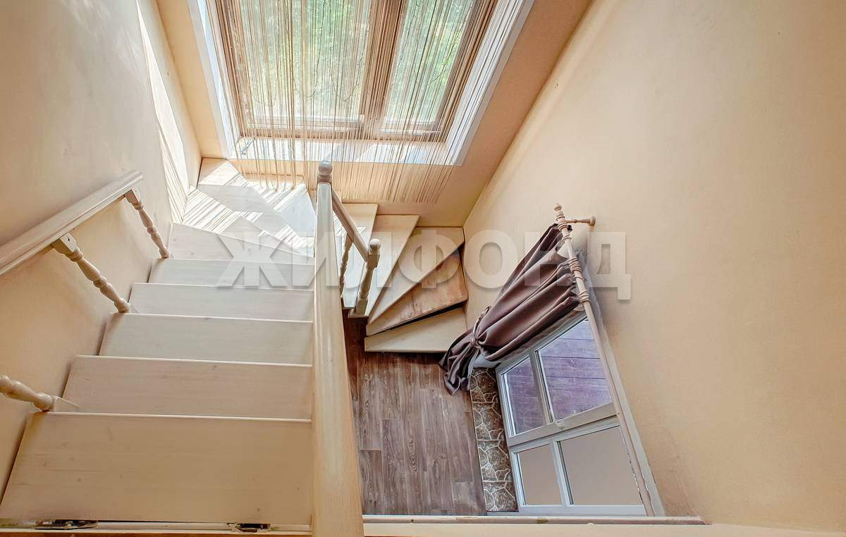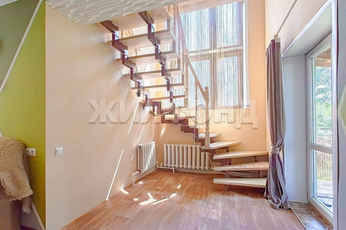 Лестничный пролет на 2й этаж с мощным металлическим каркасом и отделкой деревом освещен большим витражным окном, что дает дополнительный солнечный свет.