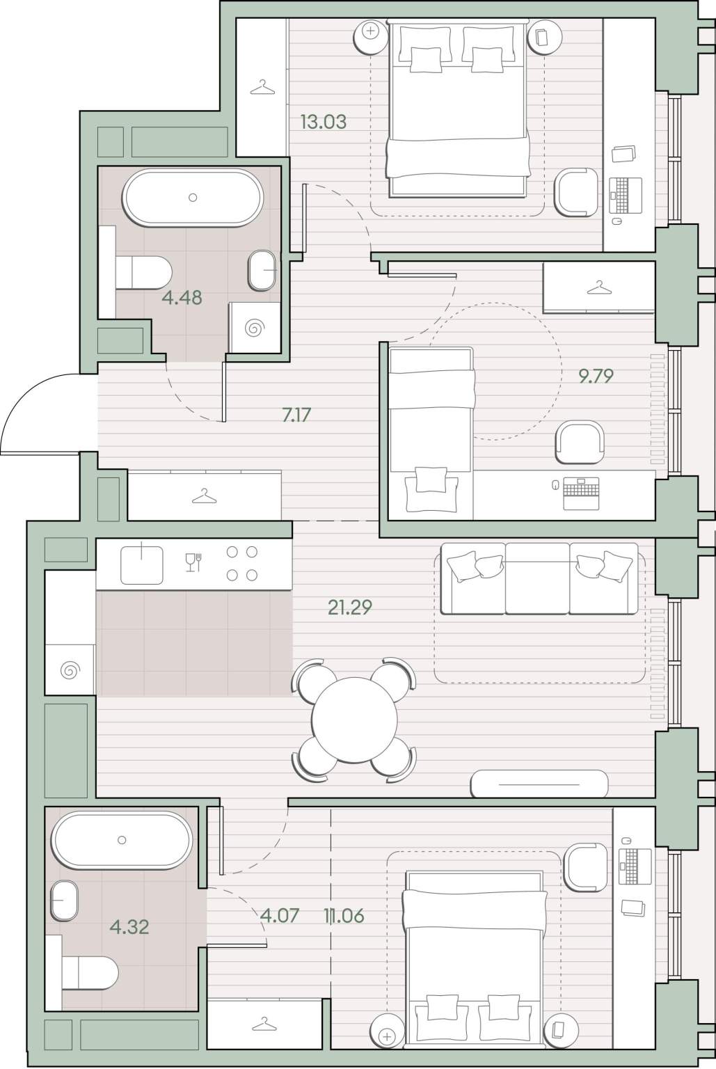 Жилая площадь 33.88 м2, кухня 21.29 м2, предчистовая отделка, комнаты изолированные.
