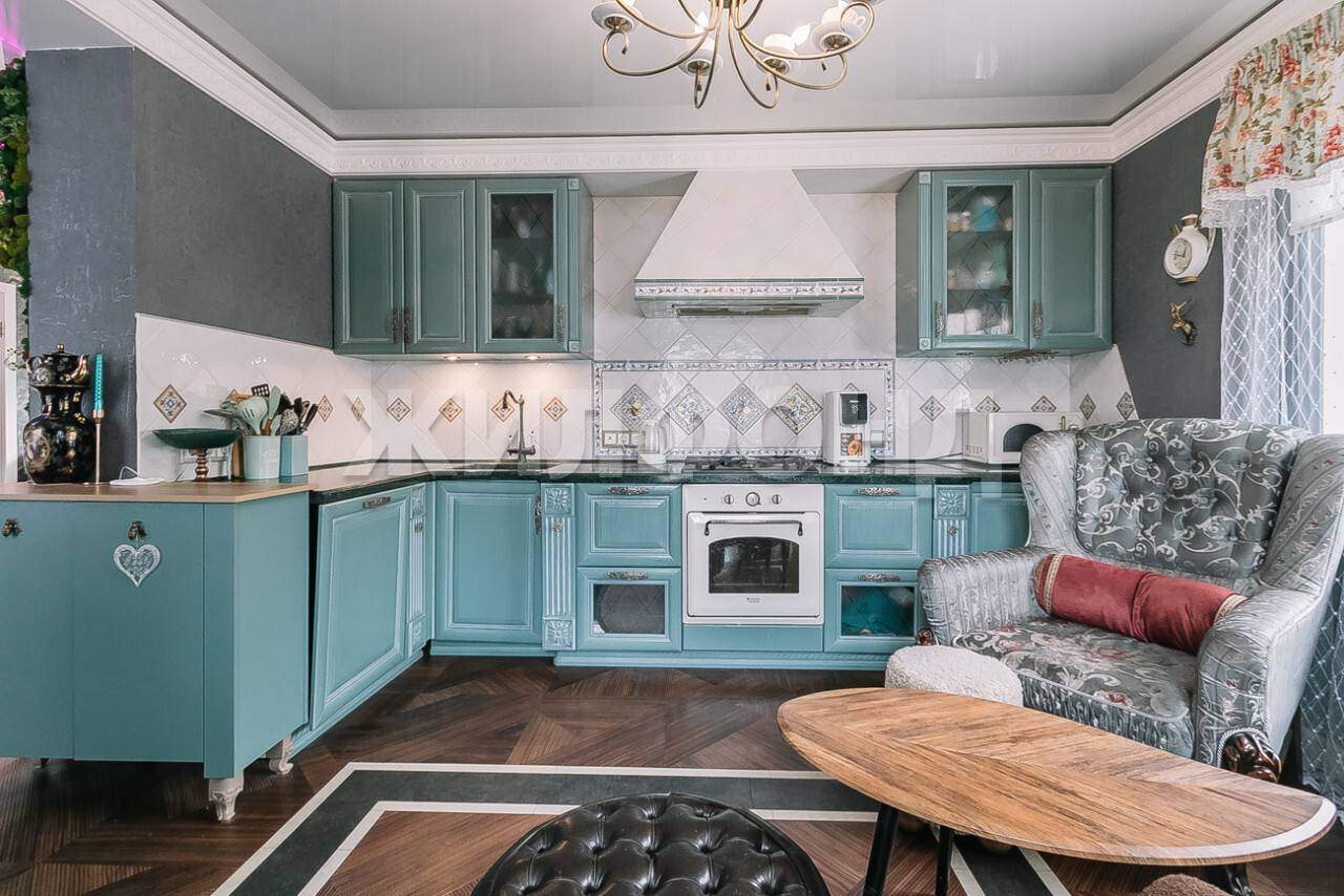 На первом этаже расположена: просторная гостиная с камином, мастер-спальня, кухня-столовая, большая гардеробная при необходимости можно использовать как детскую комнату или кабинет, техническое помещение . На втором этаже находятся 4 спальные комнаты, и большая детская спортивно- игровая комната . Внутренняя отделка исполнена в классическом стиле с применением высококачественных и дорогостоящих материалов .