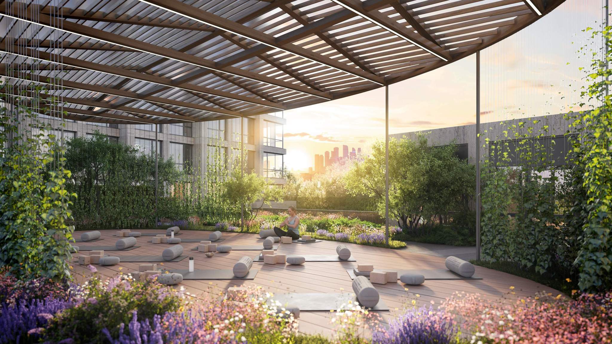 Проект благоустройства «Квартала Серебряный бор» был разработан знаменитым архитектурным бюро GAFA Architects. Специалисты создали благоустройство, которое не только дополняет архитектуру комплекса, но и становится продолжением природного ландшафта. Предусмотрено несколько ландшафтных зон для всех возрастов и разных активностей. В жаркий полдень жители смогут насладиться теплым солнцем возле открытого бассейна на шезлонге или на мягком газоне. Здесь же можно наблюдать восхитительные закаты. Для детей предусмотрены игровые площадки и полноценный игровой плейхаб «Шатер», рассчитанные на разные возрастные группы. Для мам будет беседка, чтобы можно было с комфортом наблюдать за детьми. А для подростков и их родителей будет работать воркаут зона, которая вполне может заменить фитнес-клуб.