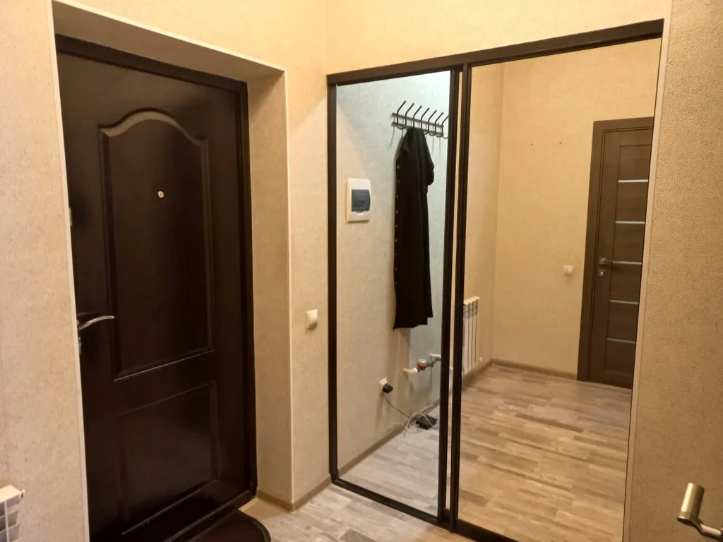 Вместительная гардеробная комната с зеркальными раздвижными дверями.
