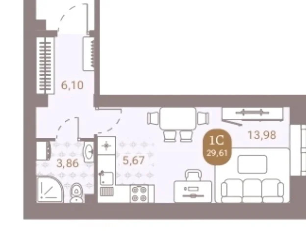 Общая площадь 29,61 кв.м. , комната 13,98 кв.м., кухня 5,67 кв.м. ,с/у совмещенный . Имеется выбор этажей и планировок .