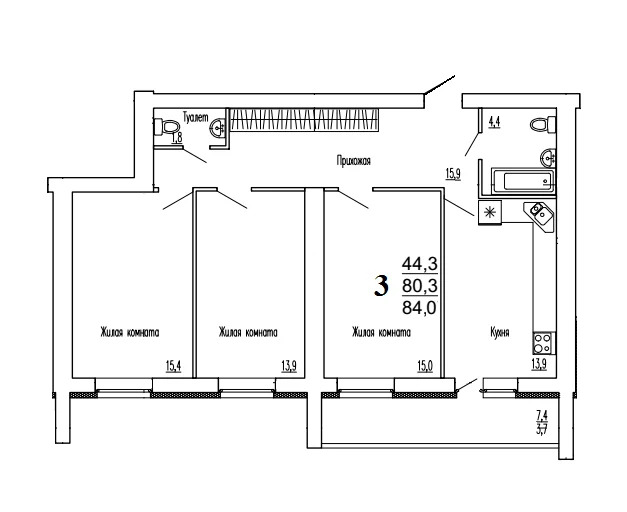 Площадь общая 84 кв.м. , жилая 44,3 кв.м. , кухня 13,9 кв.м. Высота потолков - 2,7 м. Панорамная лоджия.