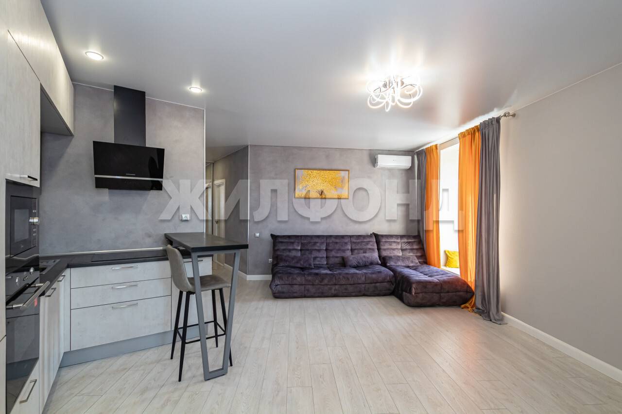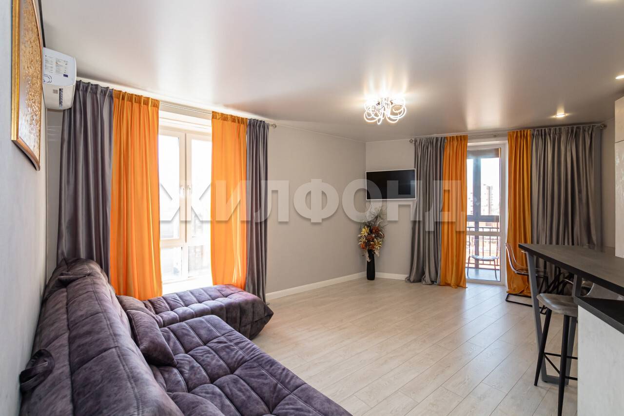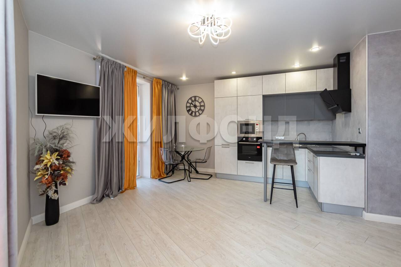 Новым хозяевам остается вся мебель и техника - кухня со встроенной техникой, барной стойкой и барным стулом, стеклянный стол со стульями, шикарный угловой диван из качественного антивандального материала, шкаф в спельне, двухместная кровать, встроенная прихожая.