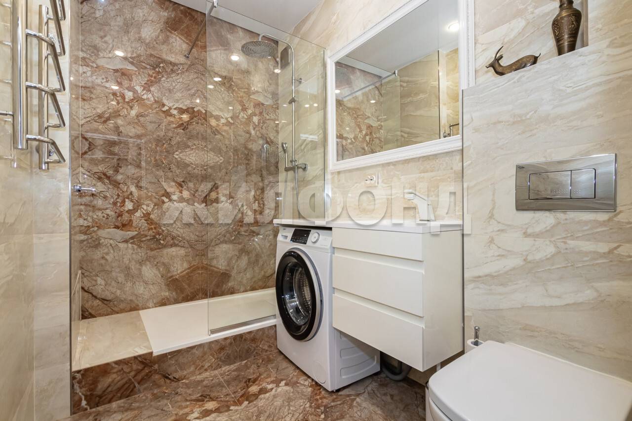 В ванной комнате для отделки использован специально заказанный эксклюзивный широкоформатный керамогранит 160*80см., из которого составлено панно на стене. В ванной комнате заменена разводка труб, сделан душевой поддон во всю стену со стенкой из каленого стекла - все заказывалось и покупалось индивидуально! Изюминка ванной комнаты - стены из редкого керамогранита с шикарным панно! Унитаз - инсталляция. Стиральная машина (на 7кг) встроена под раковину.