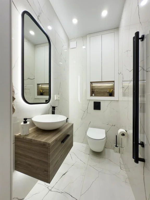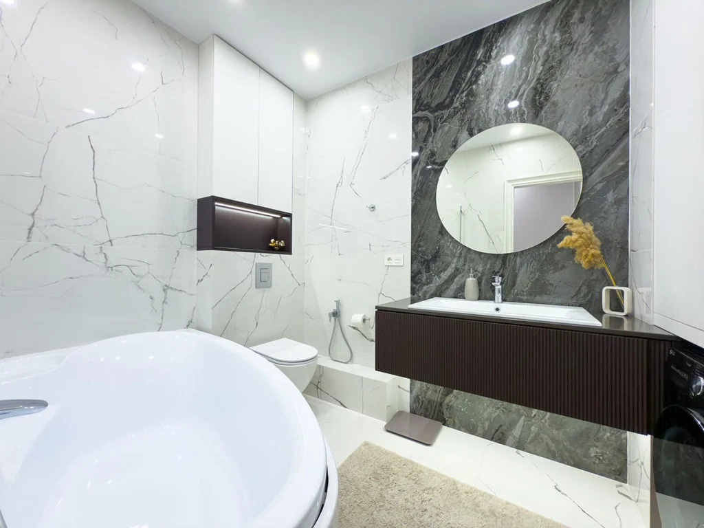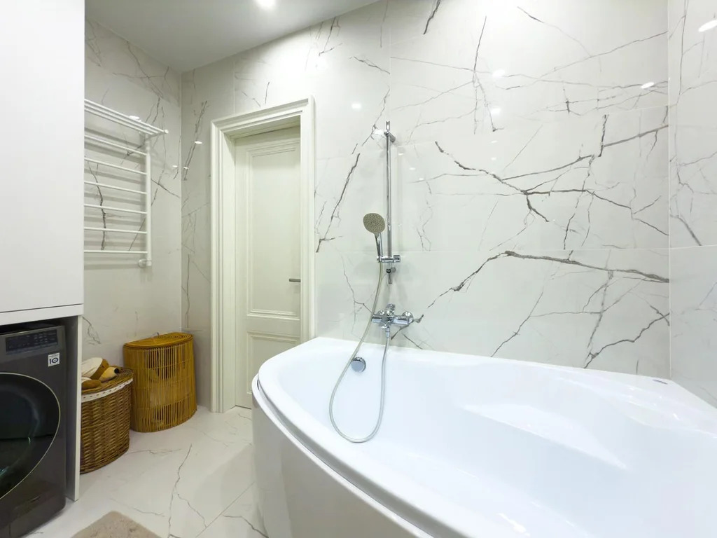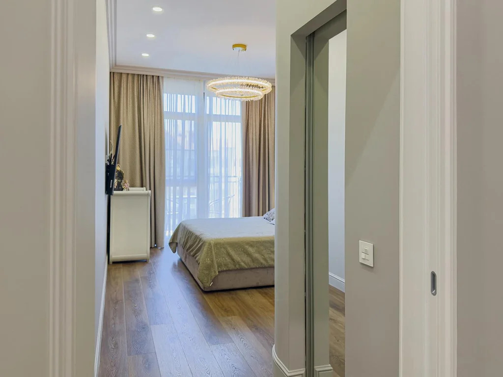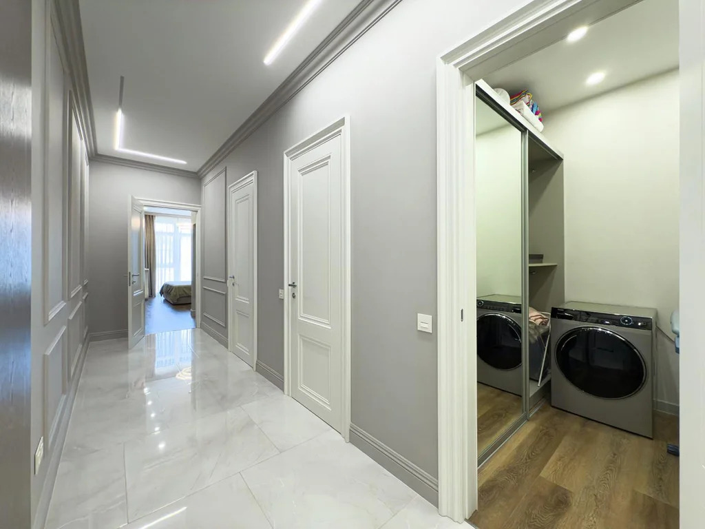 В отделке использованы только премиальные материалы: антивандальная каменно-полимерная плитка, флизелиновые обои под покраску, окрашенные легендарной английской краской Little Greene (производится с 18 века). Матовые оштукатуренные потолки с карнизами скрытого монтажа и элегантными молдингами подчеркивают изысканность интерьера. Мастер-спальня украшена эксклюзивными флизелиновыми обоями ручной росписи Geo Collection от Fresq, а шторы Blackout из итальянской ткани обеспечивают абсолютный комфорт.