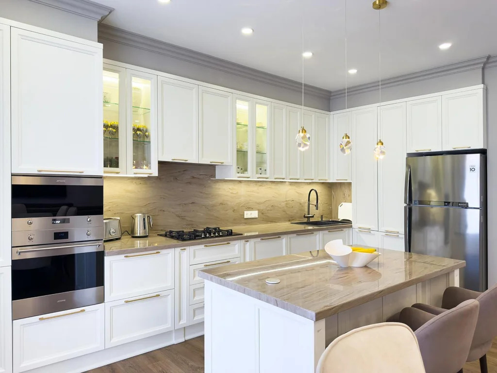Сердце дома — кухня цвета слоновой кости с матово-бархатными фасадами МДФ, оборудованная встроенной техникой производства Италии, сантехникой Omoikiri, мойкой с измельчителем и системой двойной фильтрации воды. Центральный остров для приготовления пищи станет любимым местом для семейных встреч. В ванных комнатах — испанский керамогранит, европейская сантехника и столешницы из кварца, что говорит о безупречном вкусе и качестве.