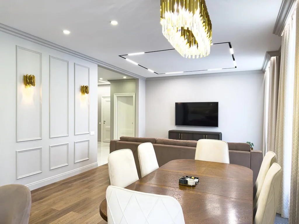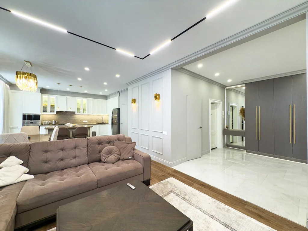 Каждая деталь интерьера продумана до мелочей. Просторная планировка на две стороны, невидимые системы хранения и панорамные стеклопакеты Rehau обеспечивают исключительную тепло- и звукоизоляцию. Конвекторы Siemens создают в квартире идеальную температуру, а множество сценариев освещения – от подсветки штор до магнитных шин с температурой 4000 К в центре кухни-гостиной – формируют неповторимый «вайб», ощущаемый сразу при входе.