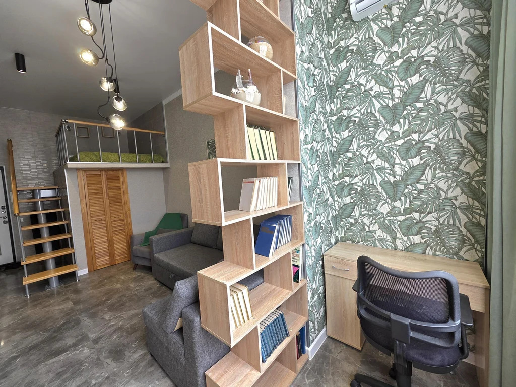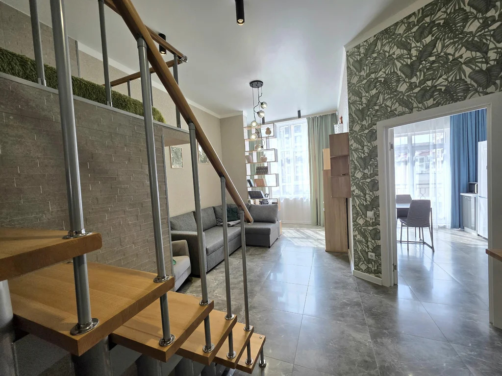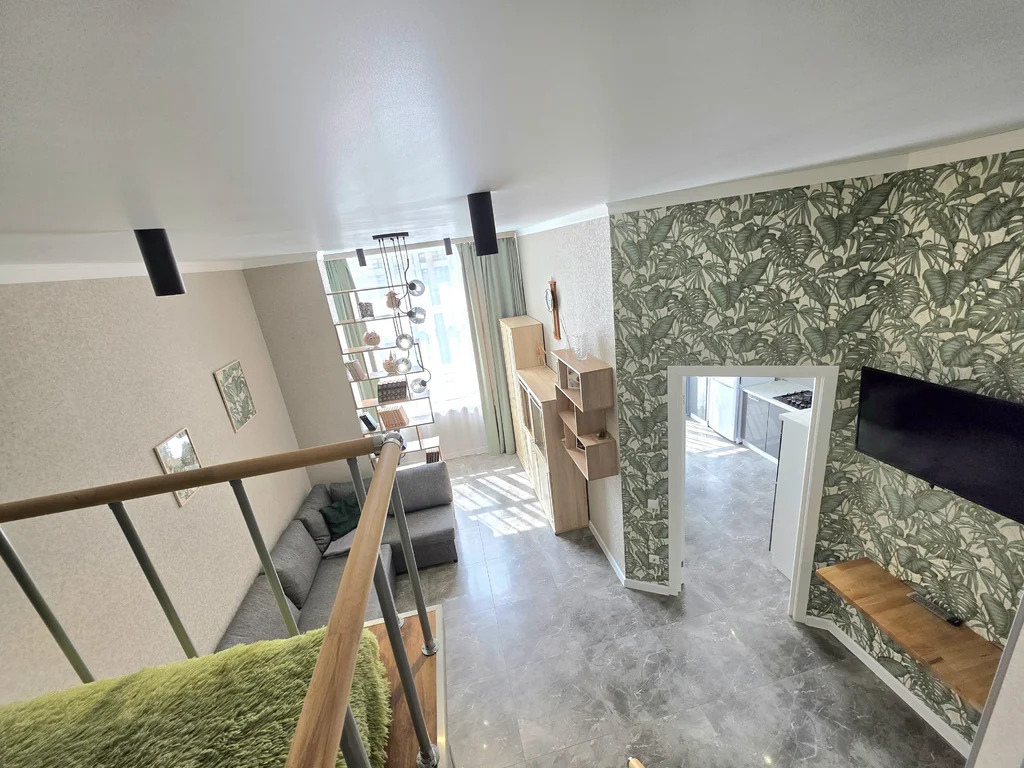 В самой квартире выполнен дизайнерский ремонт. За счет высоких потолков (3,4м) выполнен второй ярус, на котором расположена двухспальная кровать 160*200, а под ней находится полноценная гардеробная с полками и вешалами.