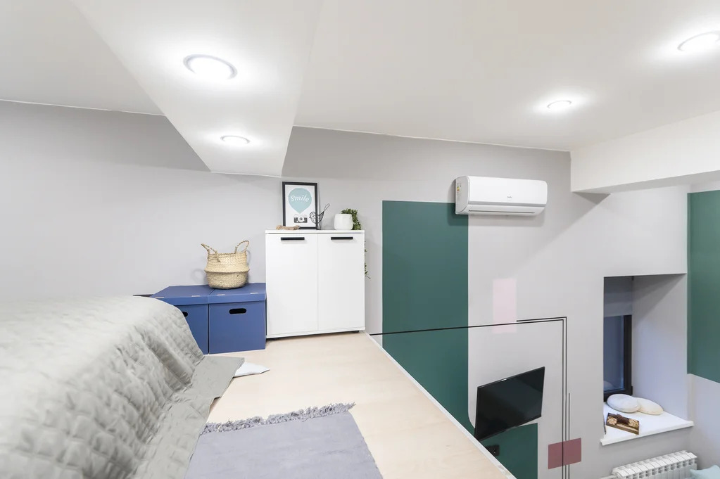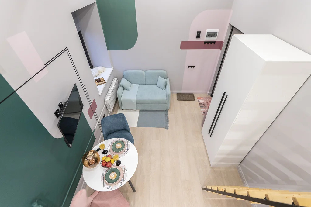 В апартаменте выполнен дизайнерский ремонт с использованием качественных материалов. Полностью укомплектован мебелью и техникой для комфортной жизни в современном комплексе. На первом этаже: кухня-гостиная, совмещенный санузел, на втором этаже – зона спальни.
